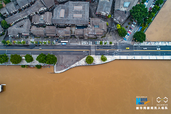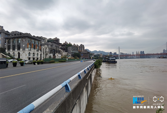 8月18日下午5点左右,重庆市南岸区,洪水基本与南滨路持平。新华网发(罗剑雄 摄)