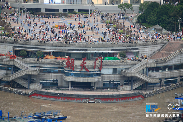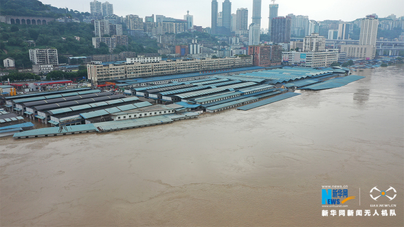 8月18日下午3点左右,重庆市渝中区,洪水通过菜园坝。新华网发(何超 摄)