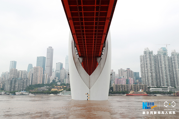 8月18日下午5点左右,重庆市渝中区洪崖洞,洪水逼近高架桥桥身。新华网发(罗剑雄 摄)