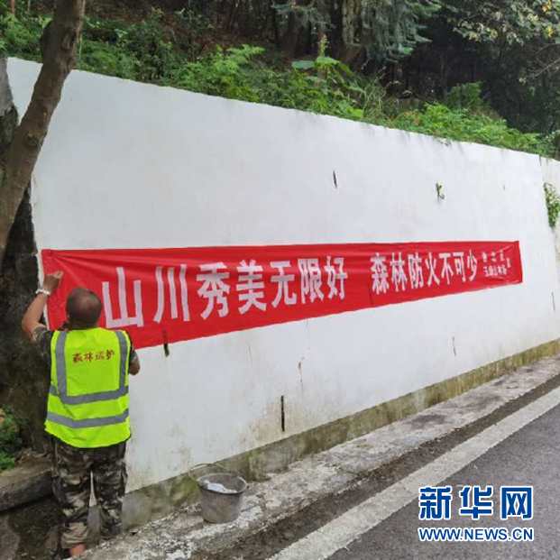 渝北区护林员在林区悬挂森林防火横幅。新华网发(受访单位供图)
