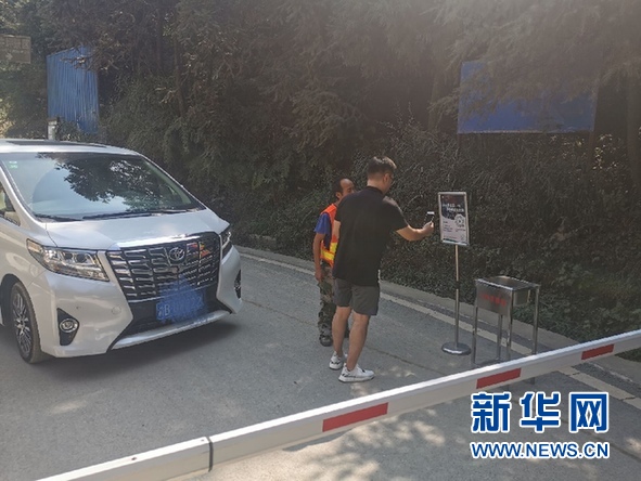 在渝北区森林防火检查站,工作人员正引导群众扫码入林。新华网发(受访单位供图)