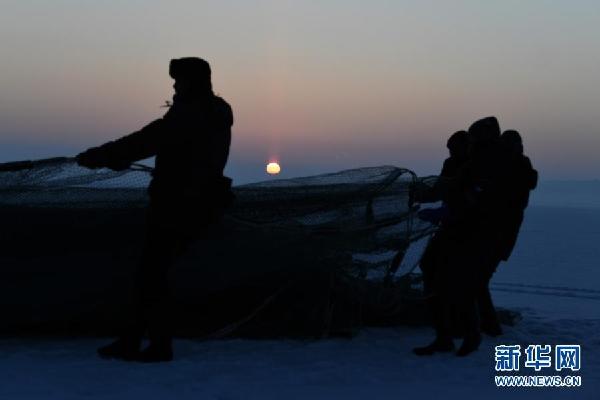 12月27日,渔工们在乌伦古湖捕鱼。