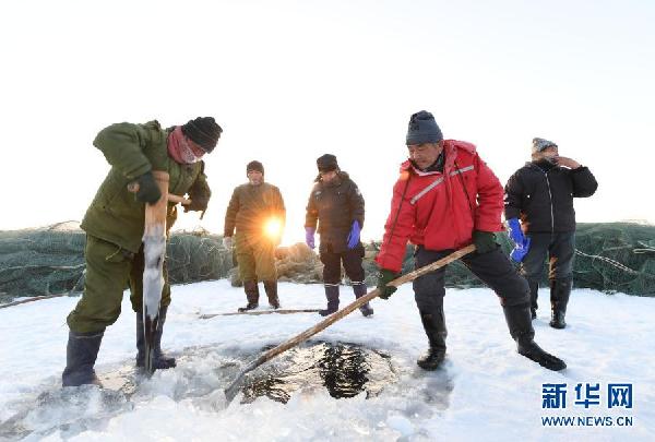 12月27日,渔工们在乌伦古湖凿开一个下网眼。