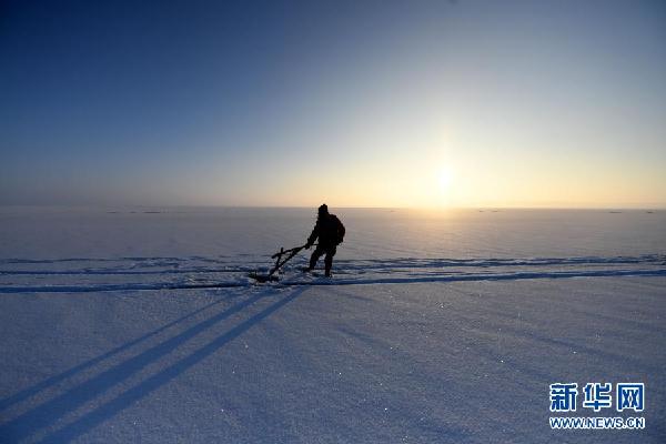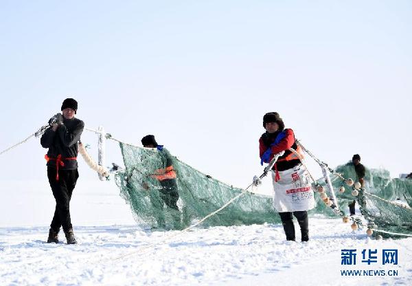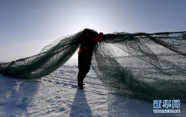 12月27日,渔工在乌伦古湖拉网。