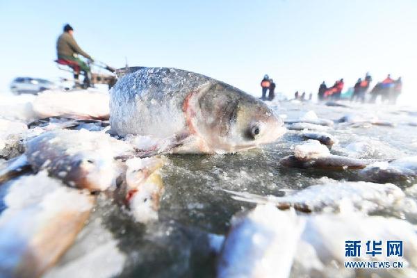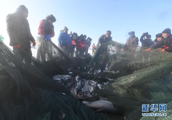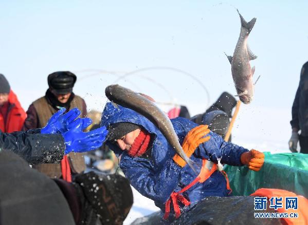 12月27日,渔工们在乌伦古湖将捕到的鱼抛至冰面,出水的鱼很快被冷冻。