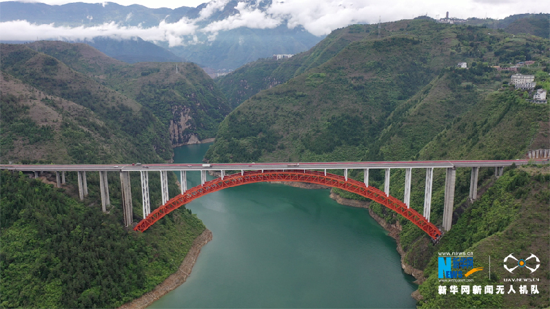 4月8日,G42沪蓉高速大宁河大桥与青山绿水白云相映成画。新华网 向进 摄
