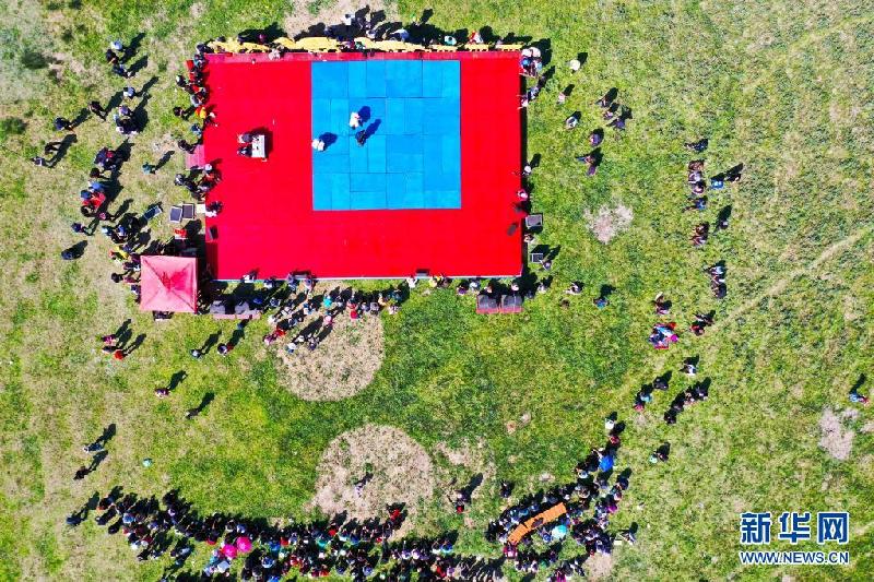 6月3日,在新疆阿勒泰地区福海县沙尔布拉克转场文化旅游小镇,牧民参加摔跤比赛(无人机照片)。