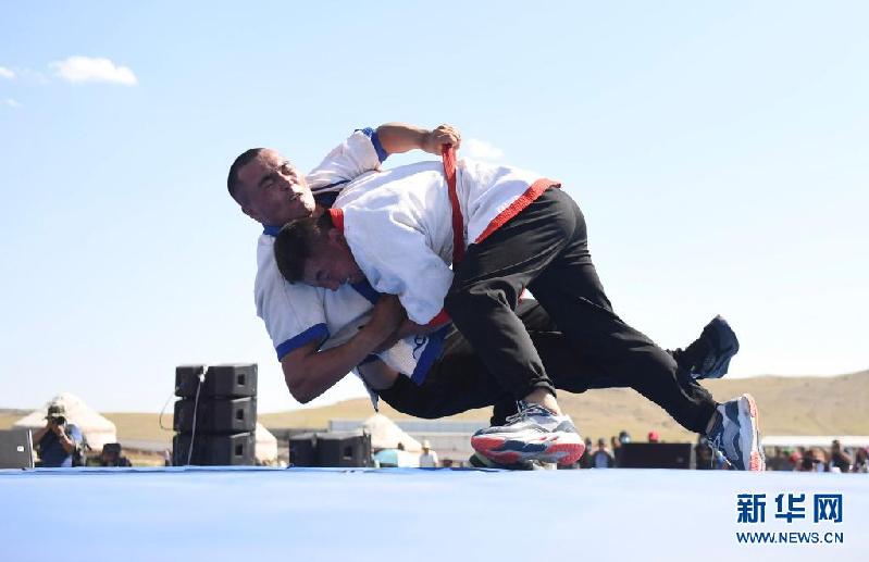 6月3日,在新疆阿勒泰地区福海县沙尔布拉克转场文化旅游小镇,牧民参加摔跤比赛。
