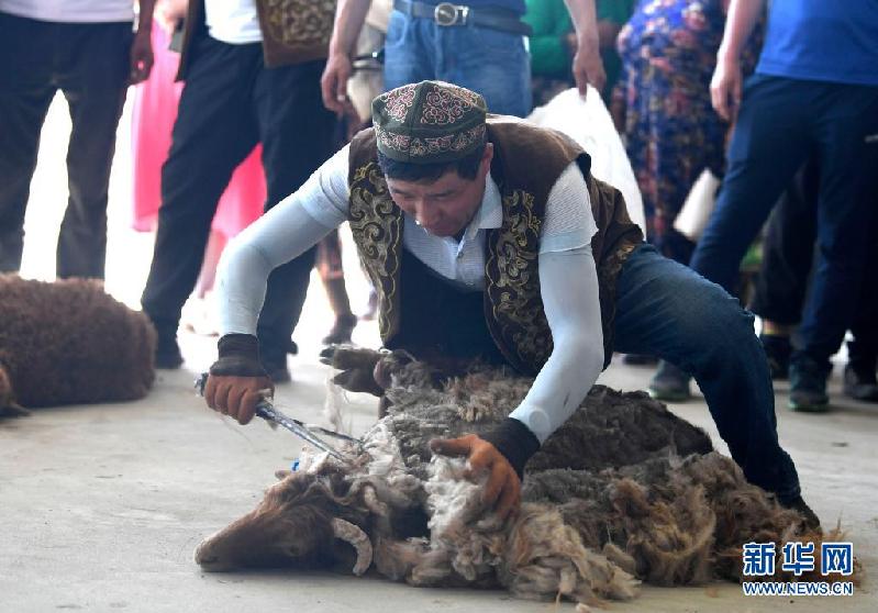 6月3日,在新疆阿勒泰地区福海县沙尔布拉克转场文化旅游小镇,牧民参加剪羊毛比赛。