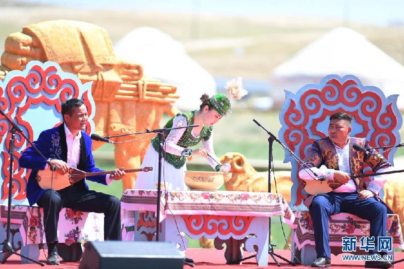 6月3日,在新疆阿勒泰地区福海县沙尔布拉克转场文化旅游小镇,人们参加阿肯阿依特斯表演。