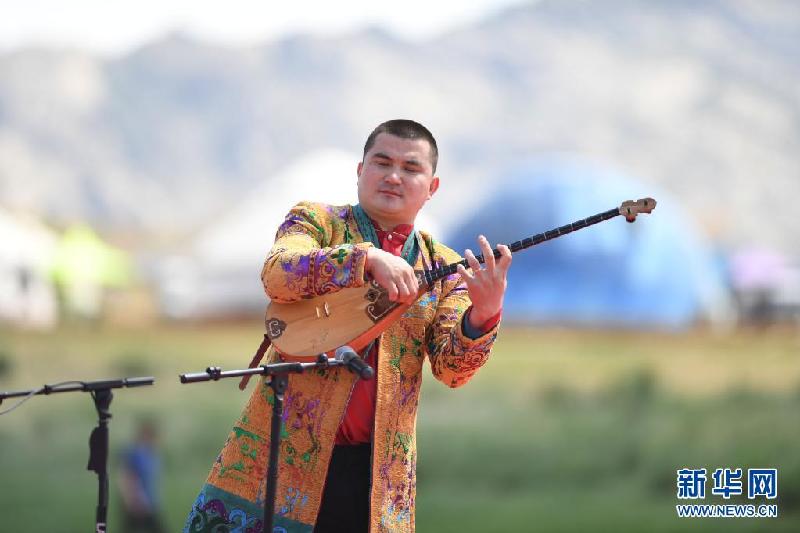 6月3日,新疆阿勒泰地区福海县沙尔布拉克转场文化旅游小镇,演员在弹奏冬不拉。