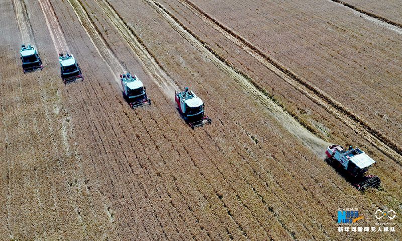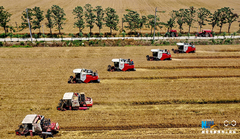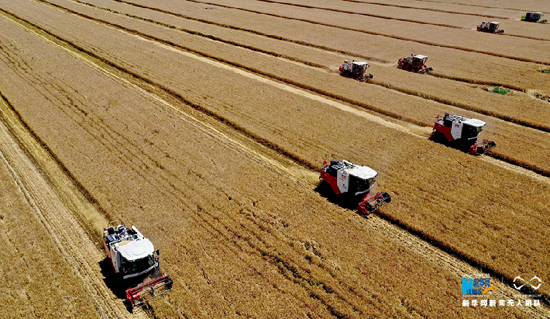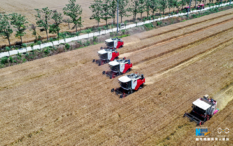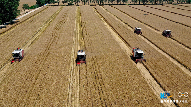在安徽省亳州市涡阳县公吉寺镇程大村,农民驾驶收割机收获小麦(6月4日无人机拍摄)。新华网发(刘勤利 李心强 摄)