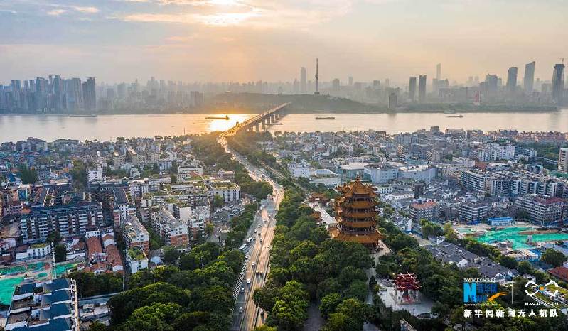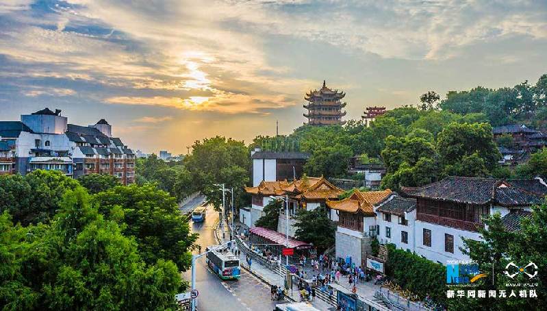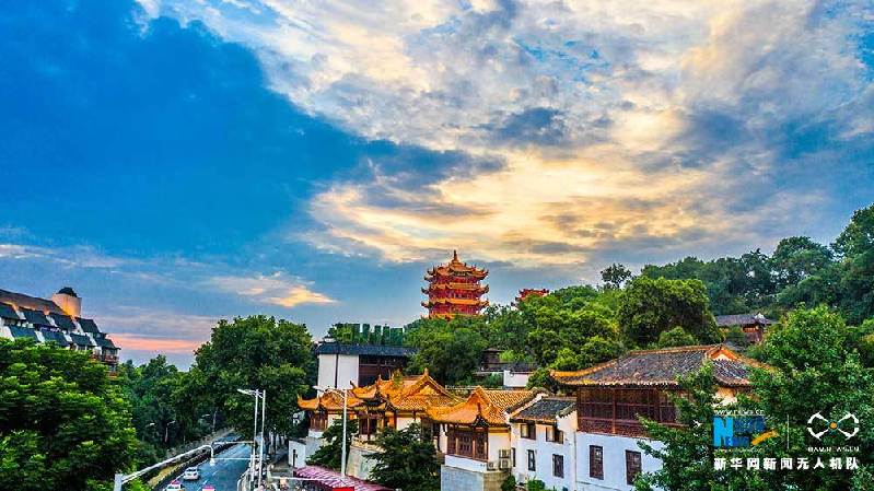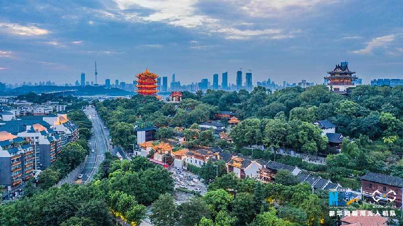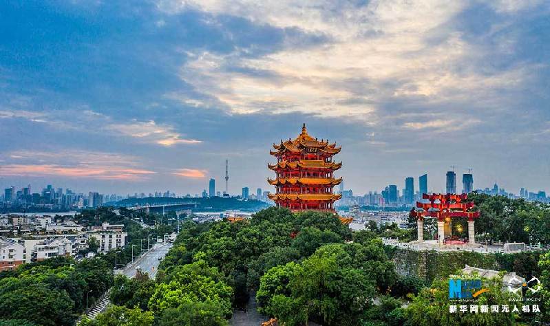 7月11日傍晚,武汉华灯初上,黄鹤楼在晚霞和灯光的映衬下美如画卷。(陈剑、赵广亮)