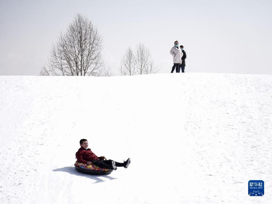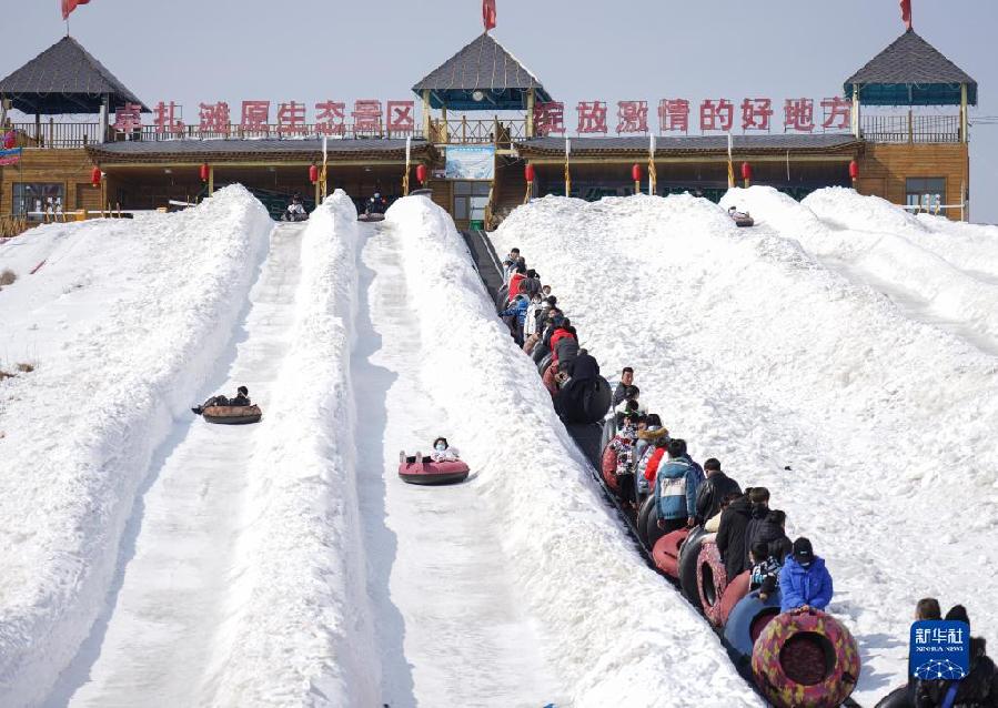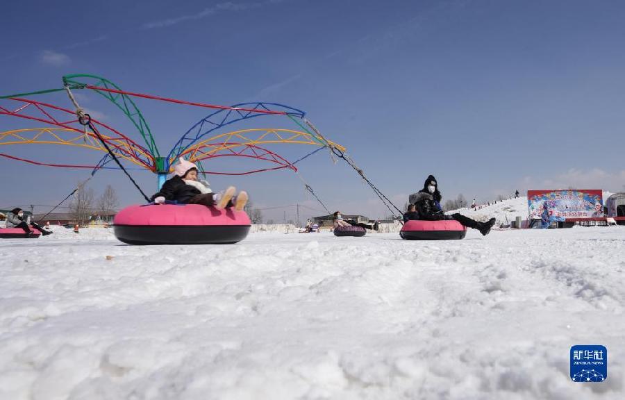 连日来,青海省互助土族自治县威远镇的卓扎滩原生态景区吸引众多游客前来体验冰雪项目的乐趣。