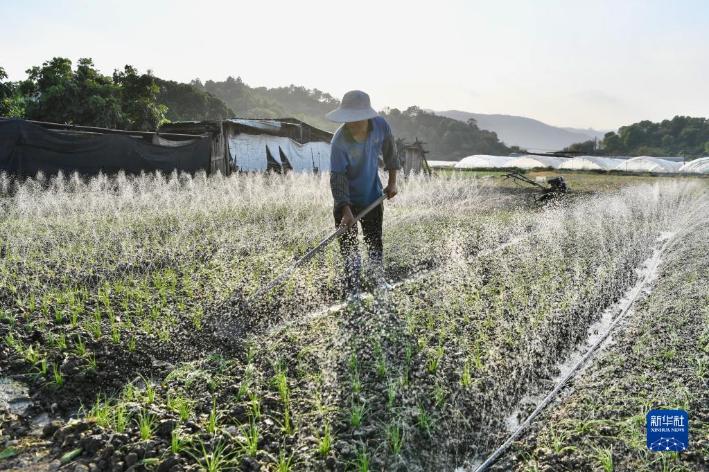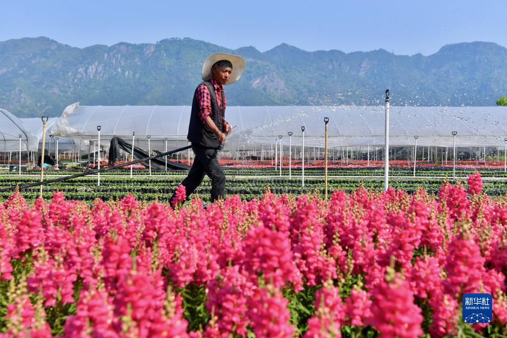 4月12日,福建省福州市闽侯县南通镇蔬菜花卉种植基地的花农在为鲜花浇水。