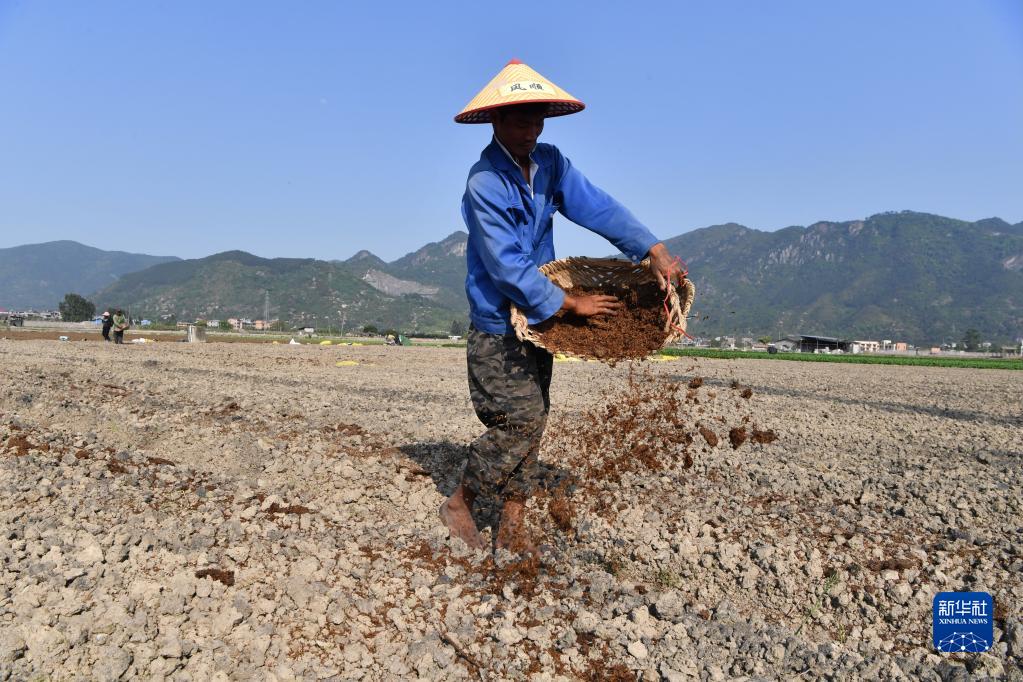 4月12日,福建省福州市闽侯县南通镇蔬菜花卉种植基地的菜农在田间施肥。