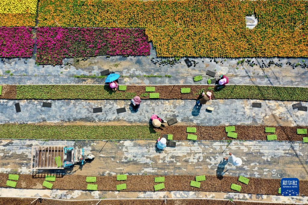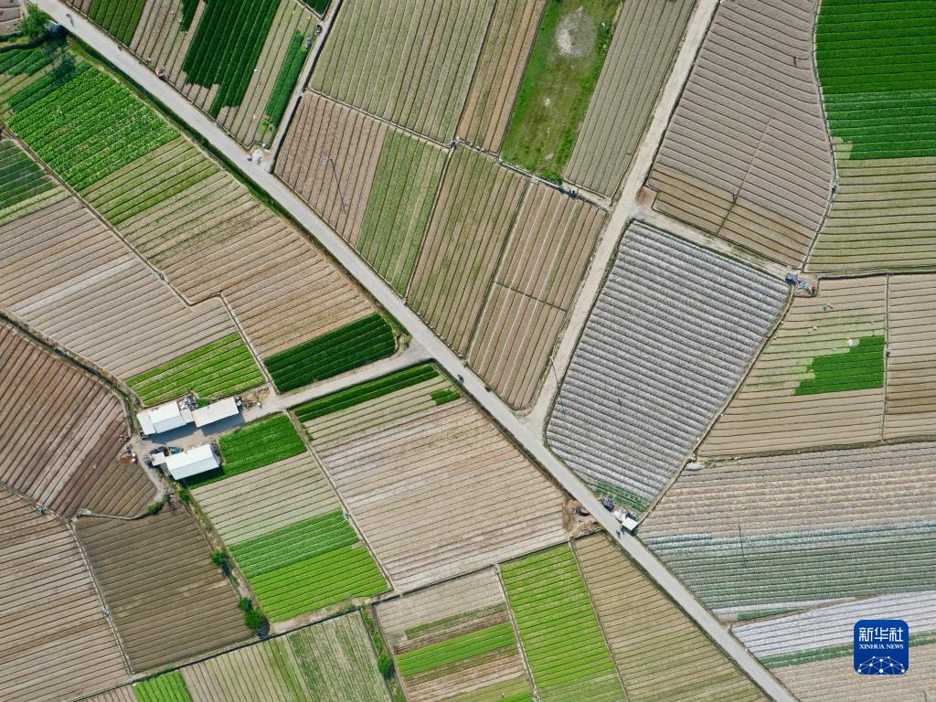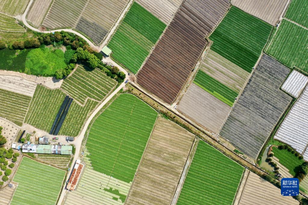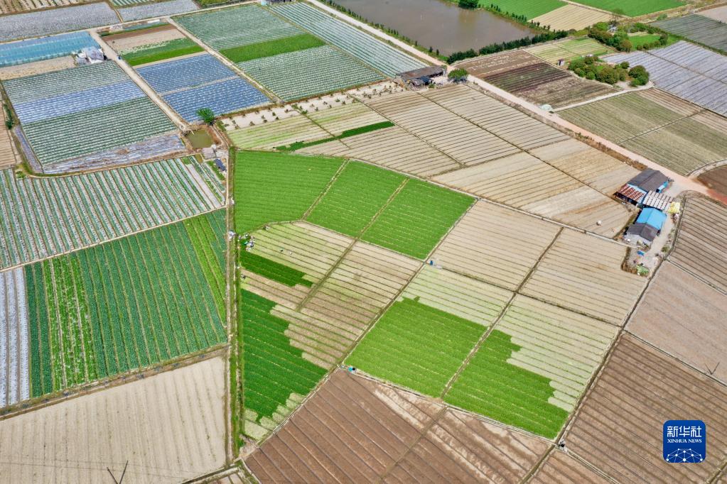 随着天气转暖,蔬菜、花卉生长旺盛,福建省福州市闽侯县南通镇蔬菜花卉种植基地迎来春种春收的繁忙时节。无人机俯瞰,一块块田地如大地调色板。