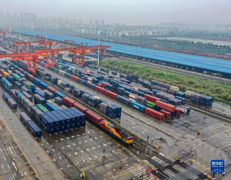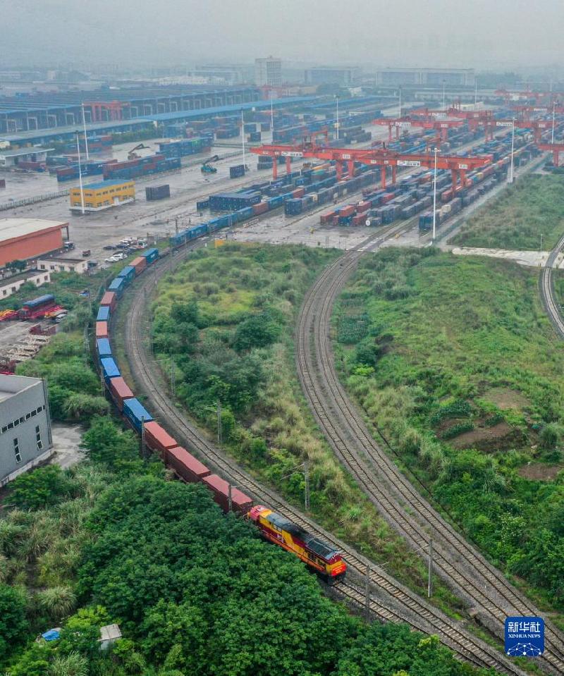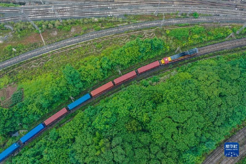 5月21日,全国首趟陆海新通道中老铁路“铁路快通”出境班列在重庆团结村中心站发车(无人机照片)。
