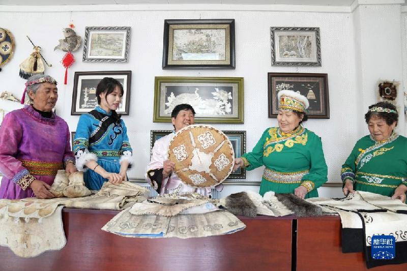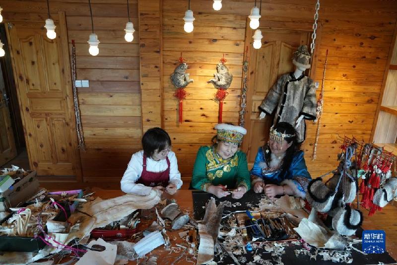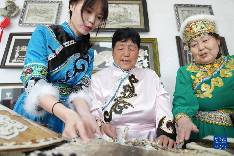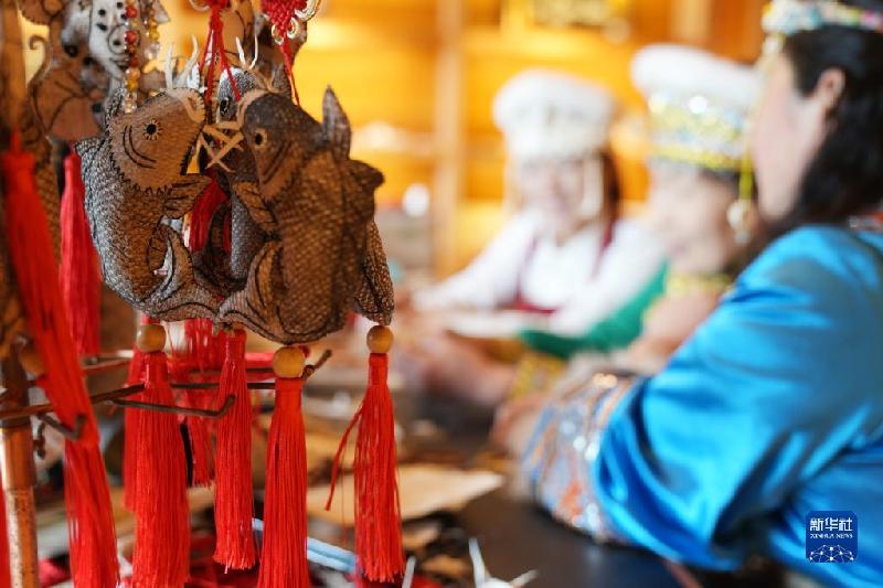 5月20日,在黑龙江省同江市八岔赫哲族乡八岔村,村民在交流赫哲族手工艺品制作技艺。