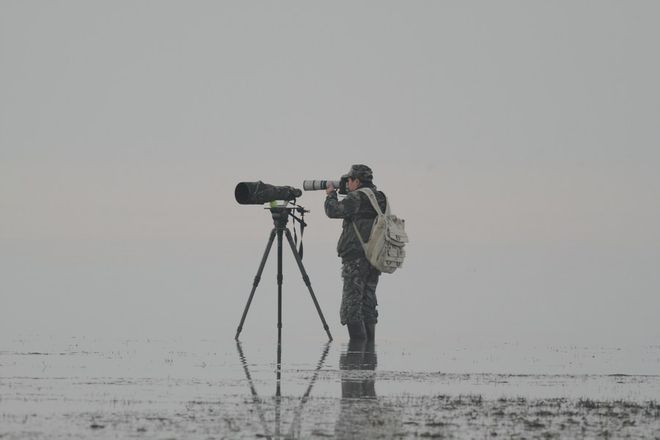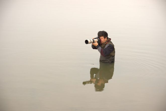 为了拍好长江江豚的照片,余会功会在中国最大淡水湖——鄱阳湖冰冷的湖水中连续站立几个小时。(受访者提供)