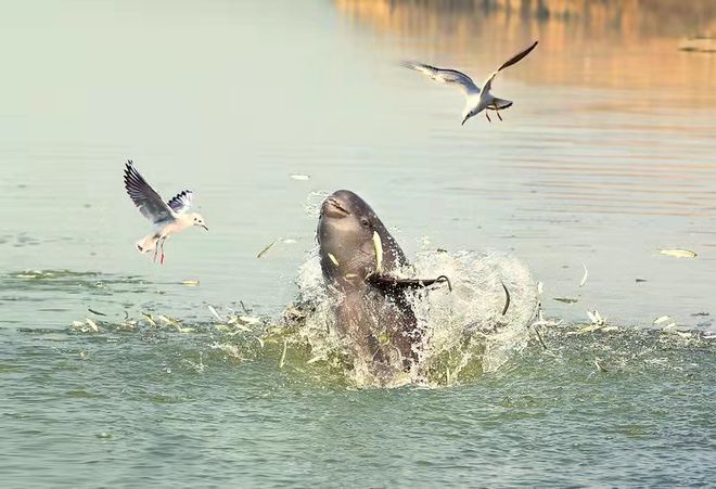 2021年,长江江豚被升级为国家一级?;ざ?。虽然?;で榭龊米?,余会功仍坚守在守护江豚的战线上。鄱阳湖上,不见了拦河网和渔船的踪影,江豚从清澈的湖水中跃出,复而下沉觅食,余会功用相机记录下这些喜人瞬间。