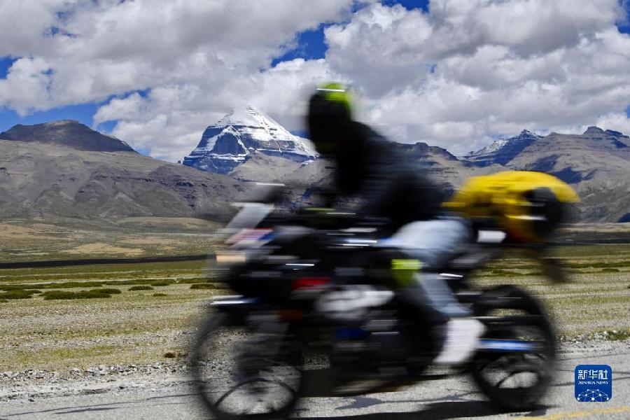 骑手驾驶摩托车经过冈仁波齐景区(8月2日摄)。