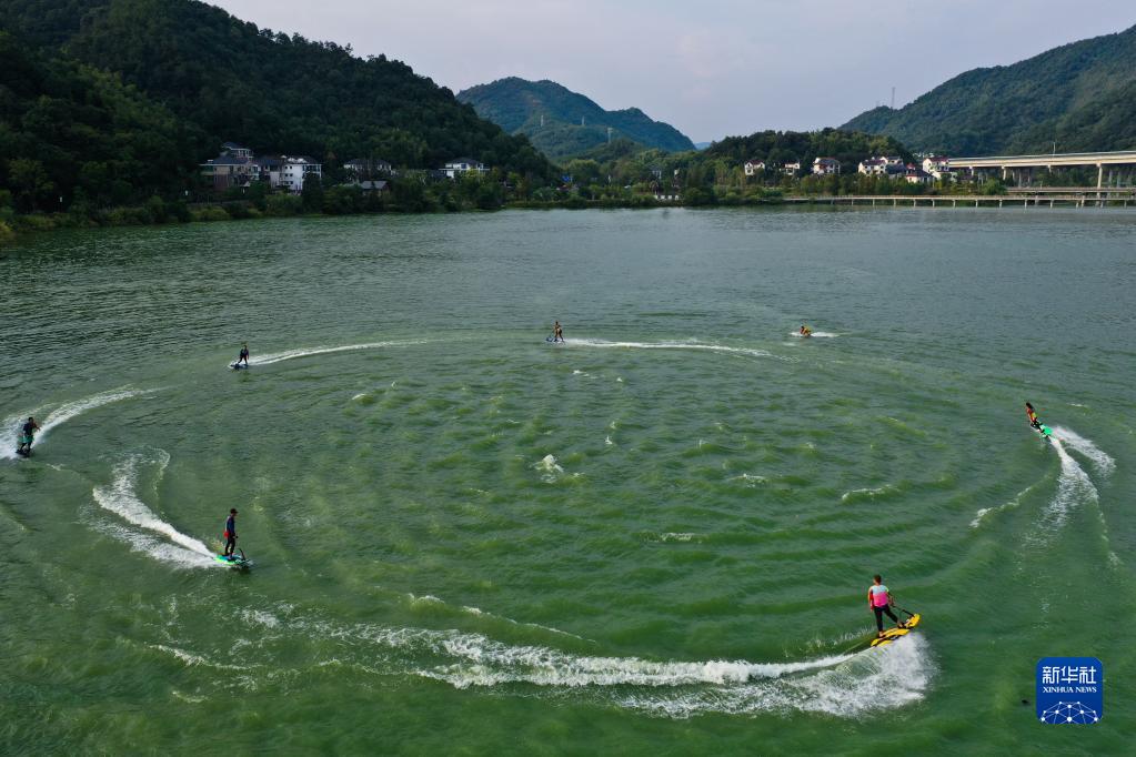8月13日,工作人员在建德市杨村桥镇十里埠黄金水岸国际滨水公园旁的水面上进行水上表演(无人机照片)。
