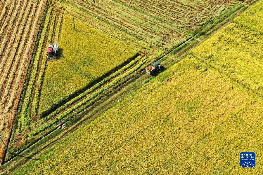 8月28日,在湖南省衡阳市衡阳县台源镇台九村,村民驾驶农机收割稻谷(无人机照片)。
