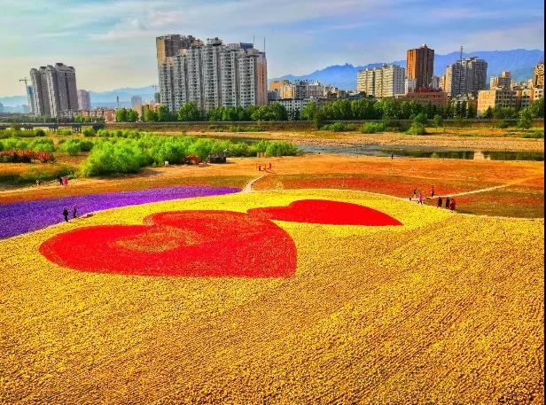 这张照片从较高的角度拍摄,从近处的花海到中间的城市建筑,再到远处的大山,使画面营造出较强的纵深感,表现出宏阔的城市美景。