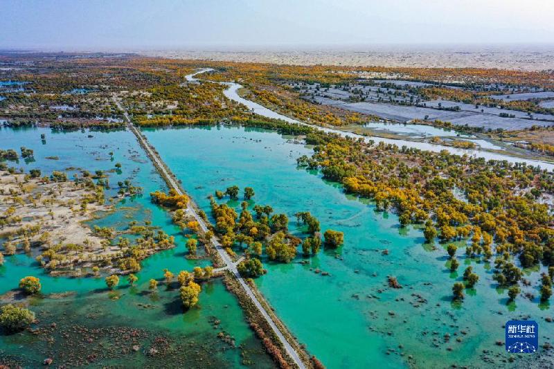 这是2020年10月12日拍摄的胡杨林区景色(无人机照片)。