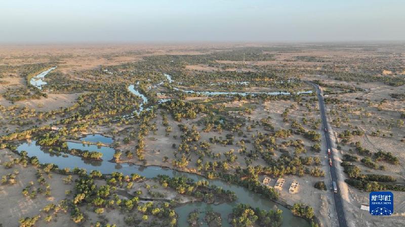 这是2022年8月18日拍摄的塔里木河下游阿拉干断面景象(无人机照片)。生态水滋润两岸胡杨等植被,同时保障交通要道少受风沙侵袭。