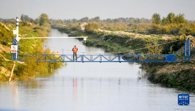 工作人员在新疆阿克苏地区沙雅县沙德克确了生态闸旁收集水文数据(2022年8月13日摄)。
