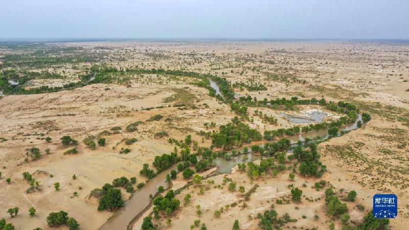 这是2022年6月20日拍摄的新疆尉犁县墩阔坦乡托布协区域,生态输水滋养了植被(无人机照片)。