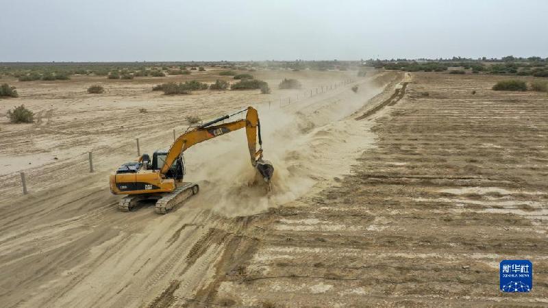 在新疆尉犁县墩阔坦乡托布协区域的引洪灌溉工程,一台挖掘机在施工(2022年6月20日摄,无人机照片)。