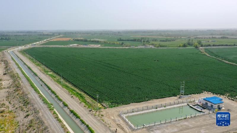 在新疆尉犁县兴平镇达西村一处高标准农田,棉花进入结铃期,智能灌溉泵房正在运行,对棉田进行无人化灌溉(2022年8月9日摄,无人机照片)。