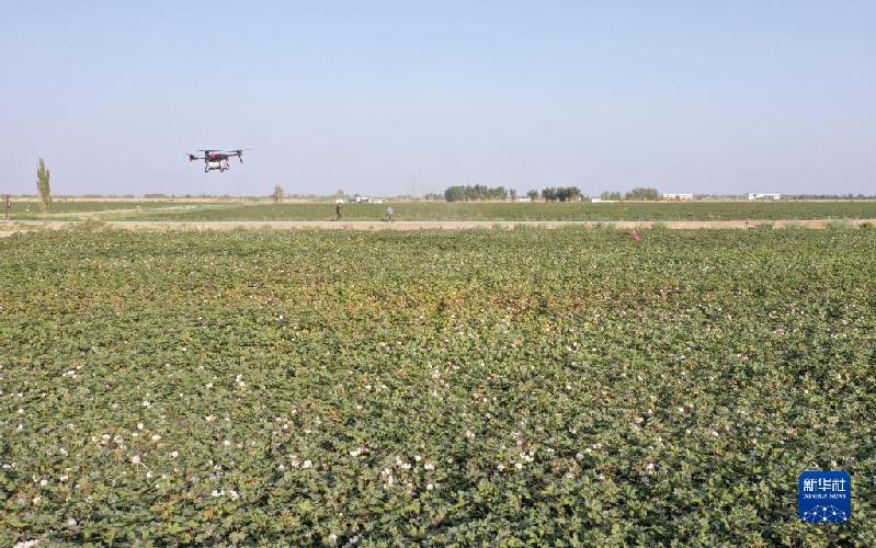 在新疆尉犁县兴平镇达西村一处高标准农田,种植户用无人机喷洒脱叶剂(2022年9月20日摄,无人机照片)。