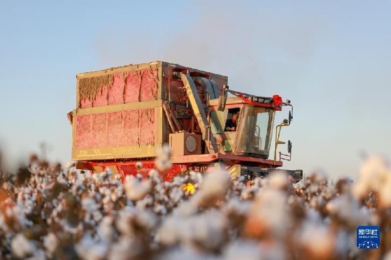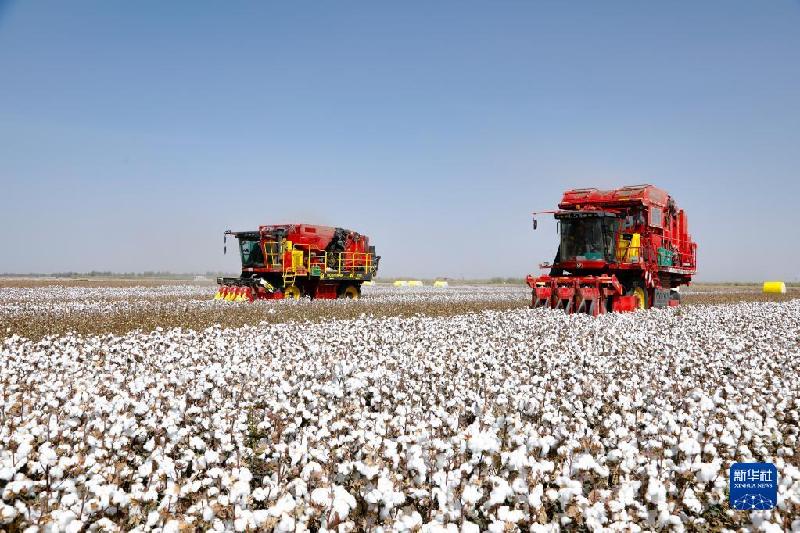 2022年9月30日,两台国产采棉机在新疆尉犁县兴平镇统其克村的棉田里采收棉花。
