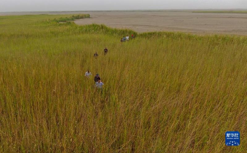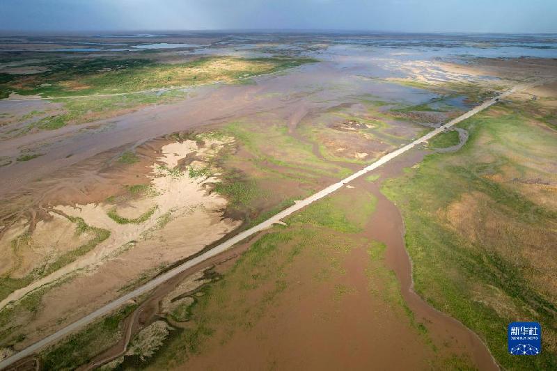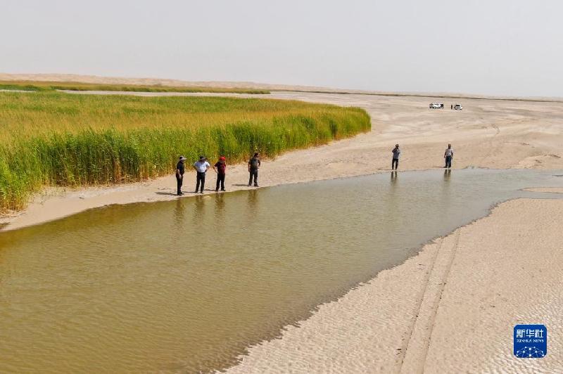 塔里木河流域管理局工作人员在车尔臣河入湖口查看生态水进入台特玛湖情况(2022年7月28日摄,无人机照片)。