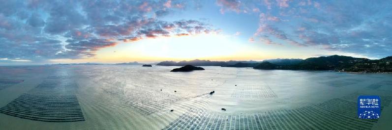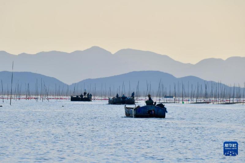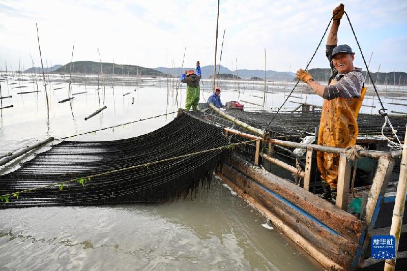 金秋十月,福建省宁德市霞浦县6.5万亩海上养殖紫菜迎来收获时节,渔民们操作收割船在大海中采收头水紫菜,展开一幅海上秋收画卷。霞浦县素有“中国紫菜之乡”美誉,形成紫菜育苗、种植、加工全产业链条,年产值近10亿元。紫菜成为当地群众增收致富的支柱产业。