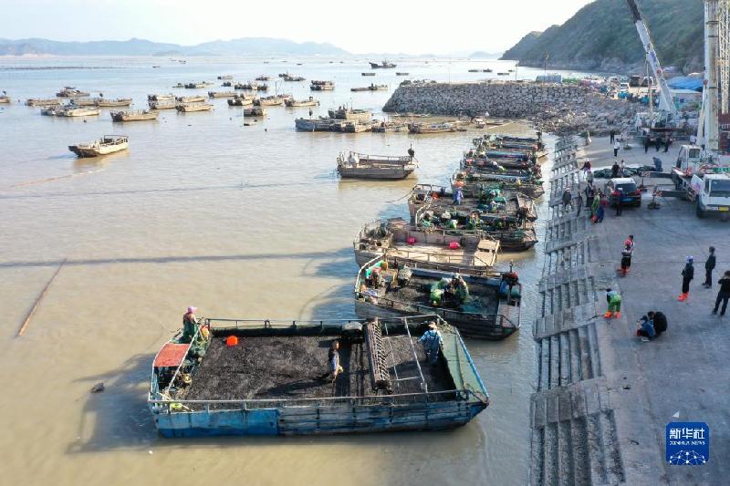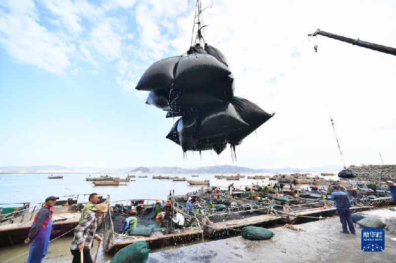 10月21日,工作人员在福建省霞浦县松山街道沙塘街村码头吊运新收割的紫菜。