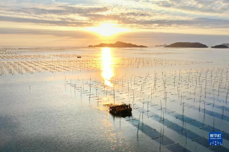 10月21日,福建省霞浦县松山街道沙塘街村渔民在朝阳照耀的大海上收割头水紫菜(无人机照片)。
