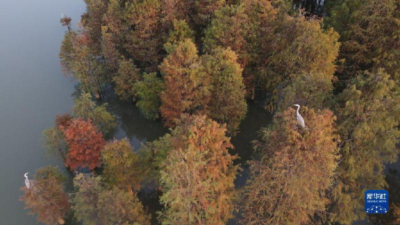 这是2022年10月29日拍摄的巢湖之畔红杉林(无人机照片)。