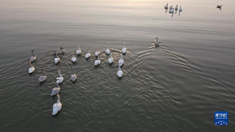一群候鸟在合肥市肥西县的巢湖湖面停留(无人机照片,2022年11月9日摄)。