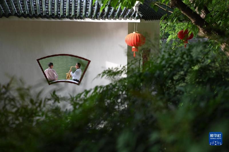 2021年5月5日,市民在合肥市环城公园吹奏乐器。