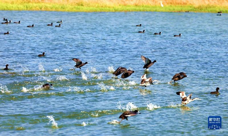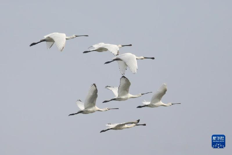 这是2022年10月22日拍摄的合肥市巢湖上空飞翔的候鸟。