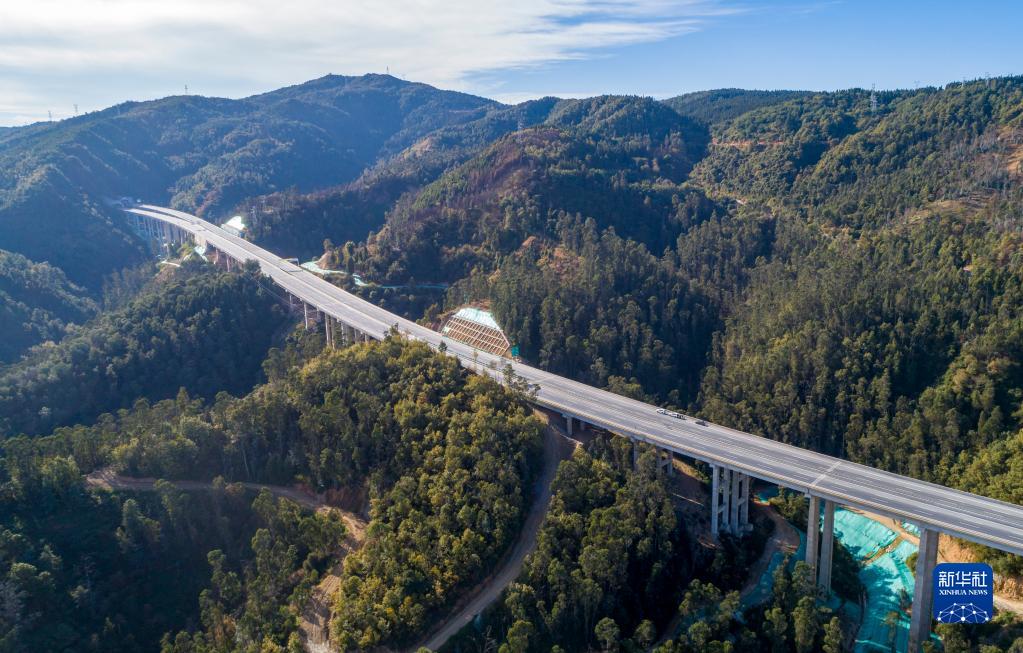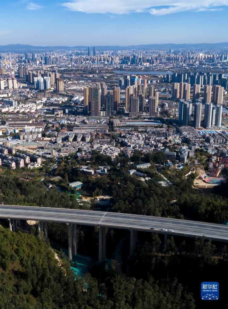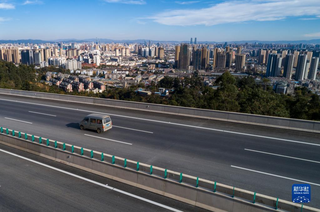 这是12月8日拍摄的新昆楚高速昆明入城段一景,远处是昆明主城区(无人机照片)。新华社记者 陈欣波 摄