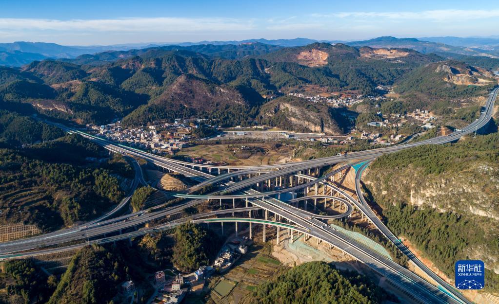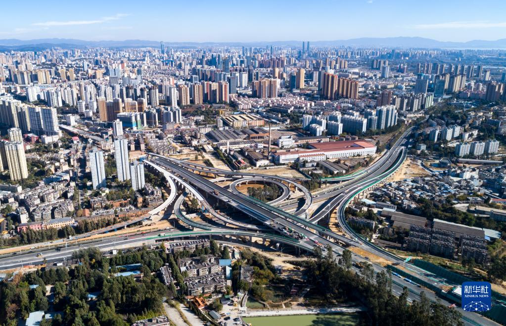 这是12月8日拍摄的新昆楚高速昆明西北绕城枢纽立交,左上到右下是新昆楚高速,左下到右上是昆明绕城高速(无人机照片)。新华社记者陈欣波 摄