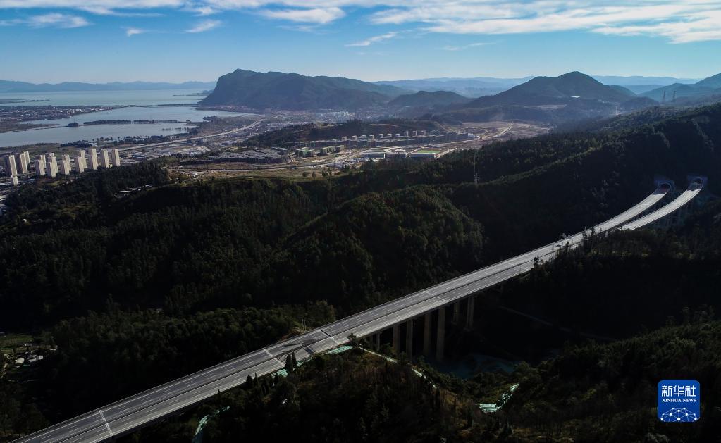 这是12月8日拍摄的新昆楚高速昆明入城段一景,远处是昆明滇池及西山景区(无人机照片)。新华社记者 陈欣波 摄