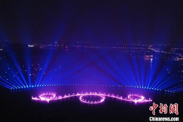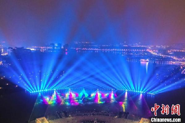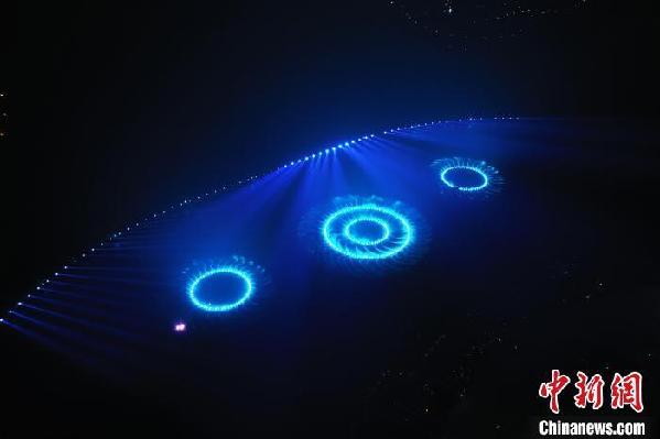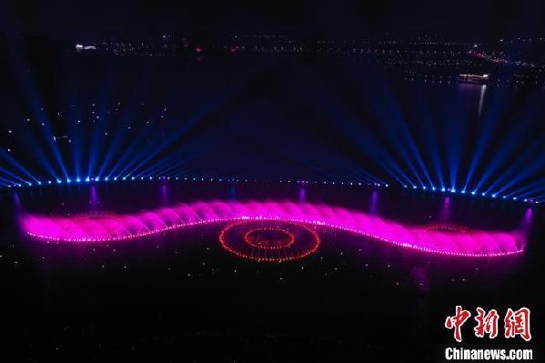 航拍位于江西省南昌市红谷滩区九龙湖公园的光影水秀音乐喷泉表演。刘占昆 摄