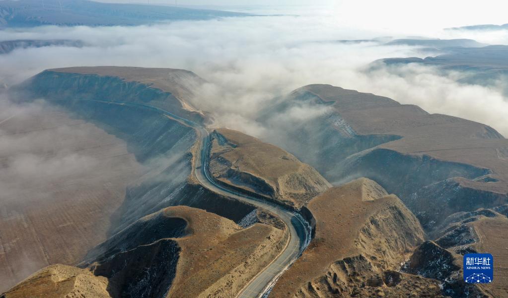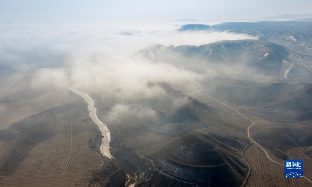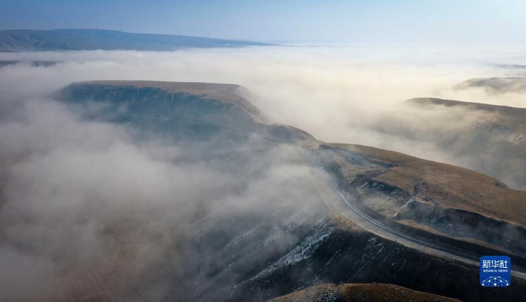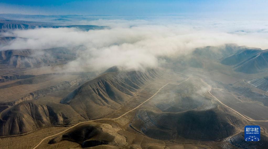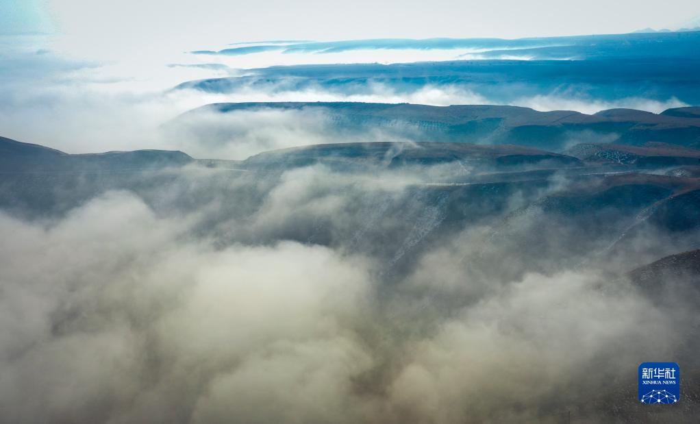当日,宁夏吴忠市同心县的山谷间出现云海景观,农田、旱塬、公路在雾中若隐若现,景色壮美。